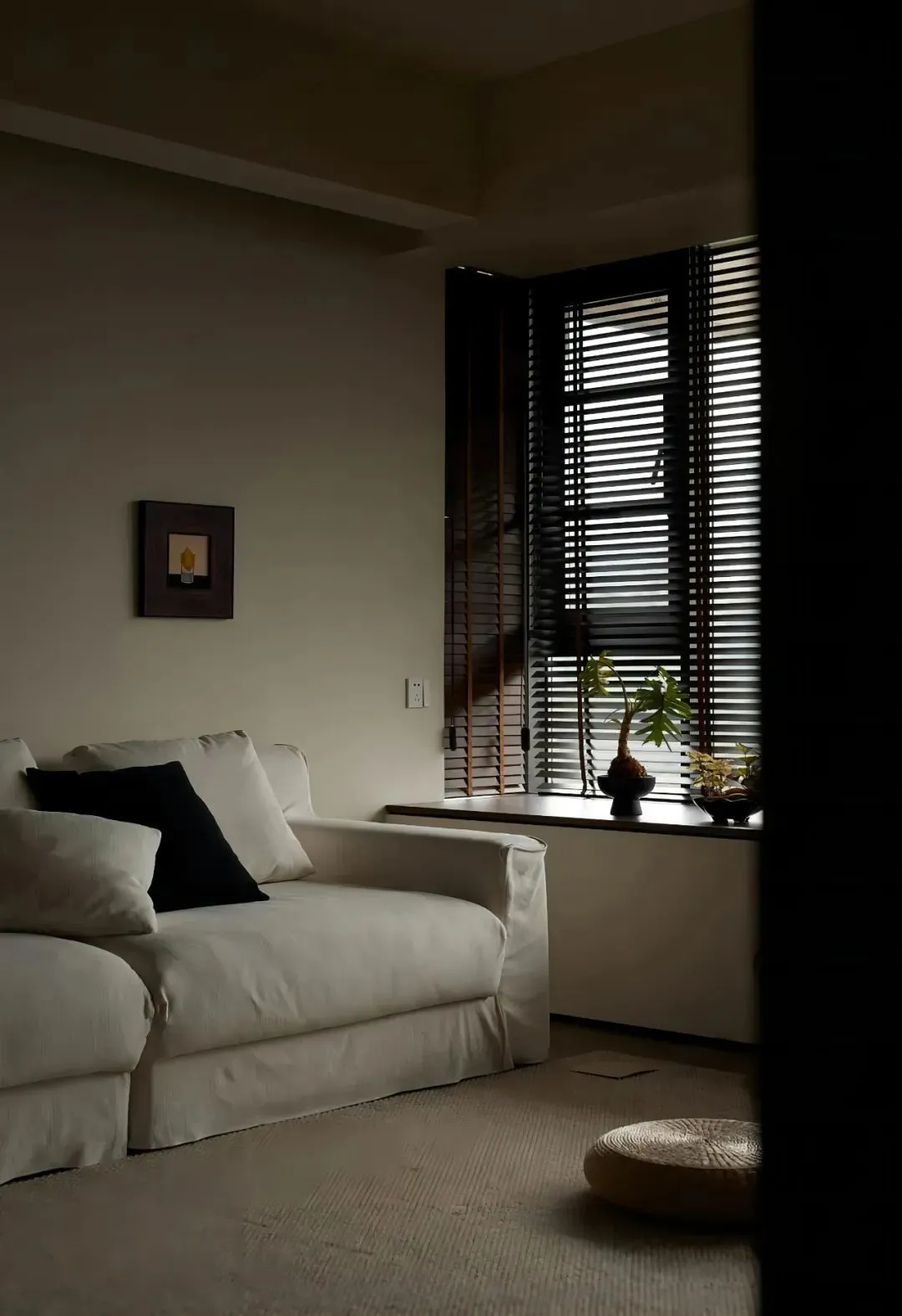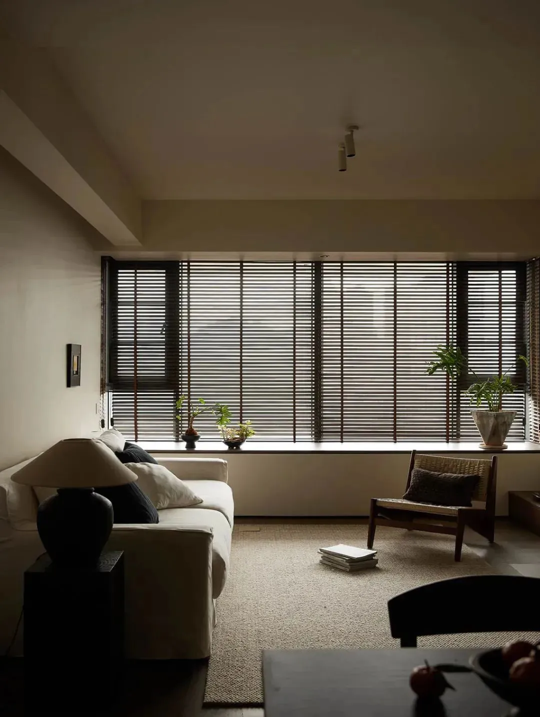 The design without main lamp in the living room visually stretches the floor height, the wooden countertop design makes the bay window more warm, and the retro shutters allow the indoor light and shadow to be adjusted freely.