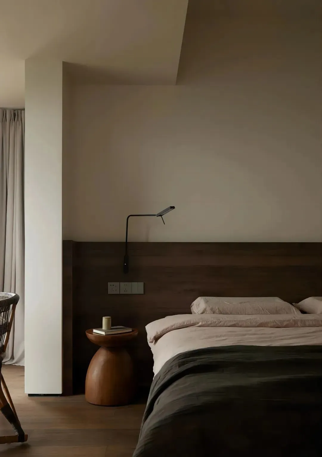 The dark brown wood veneer panel is designed as the bedside background of the half wall, and the same color series with the floor reflects the unity of the space and creates an immersive sleeping area.