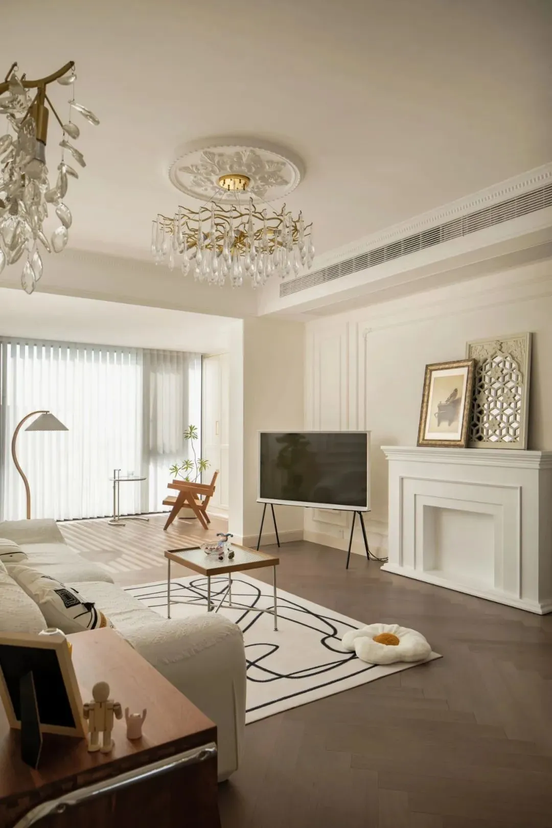 A large area of milk coffee color lays out the gentle feeling of home precipitation over the years. The whole house is paved with herringbone oak floor, and the laying angle is consistent with the lighting direction, creating a smooth sense of extension. Coupled with the embellishment of French plaster lines and carved shapes, elegance and romance coexist.