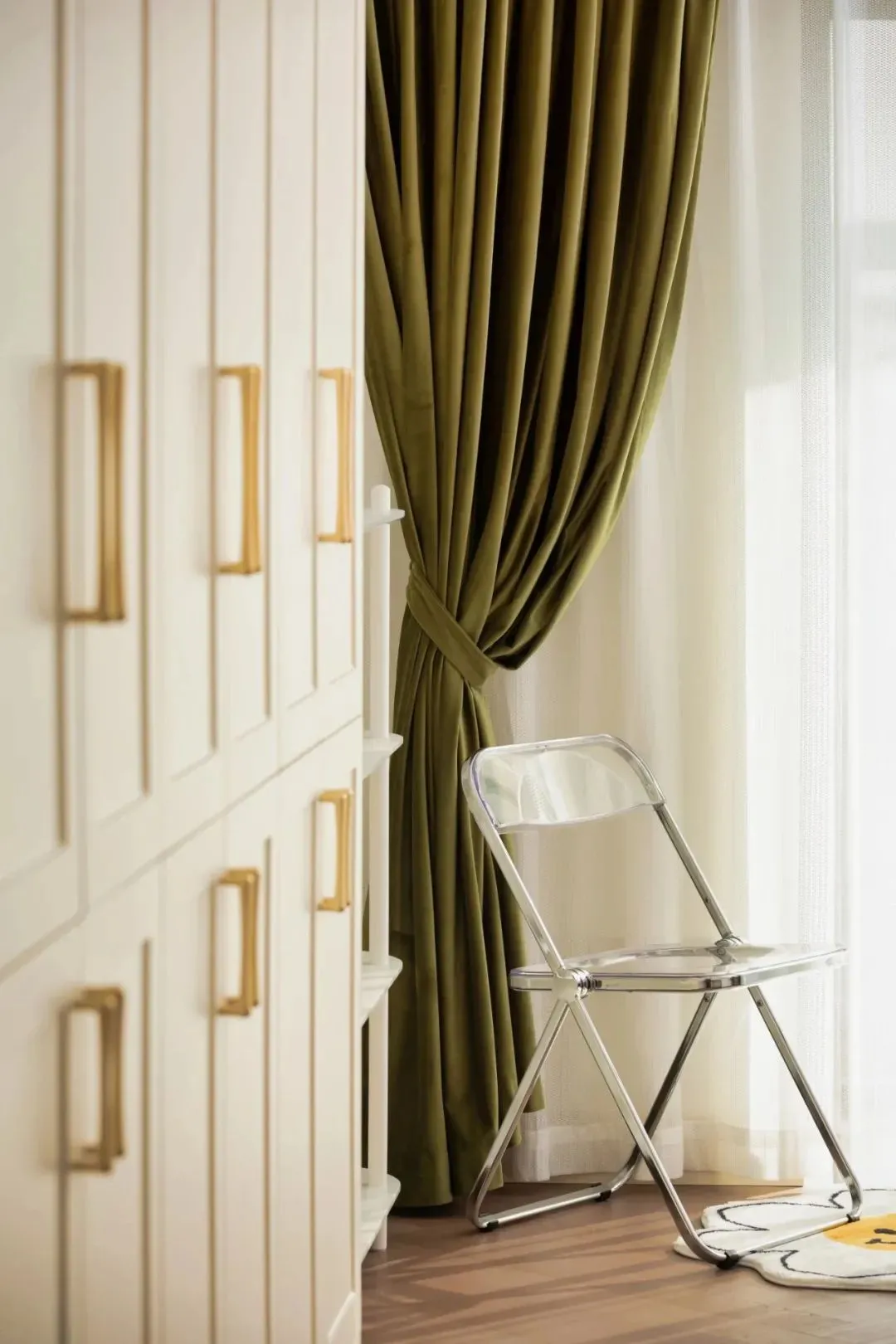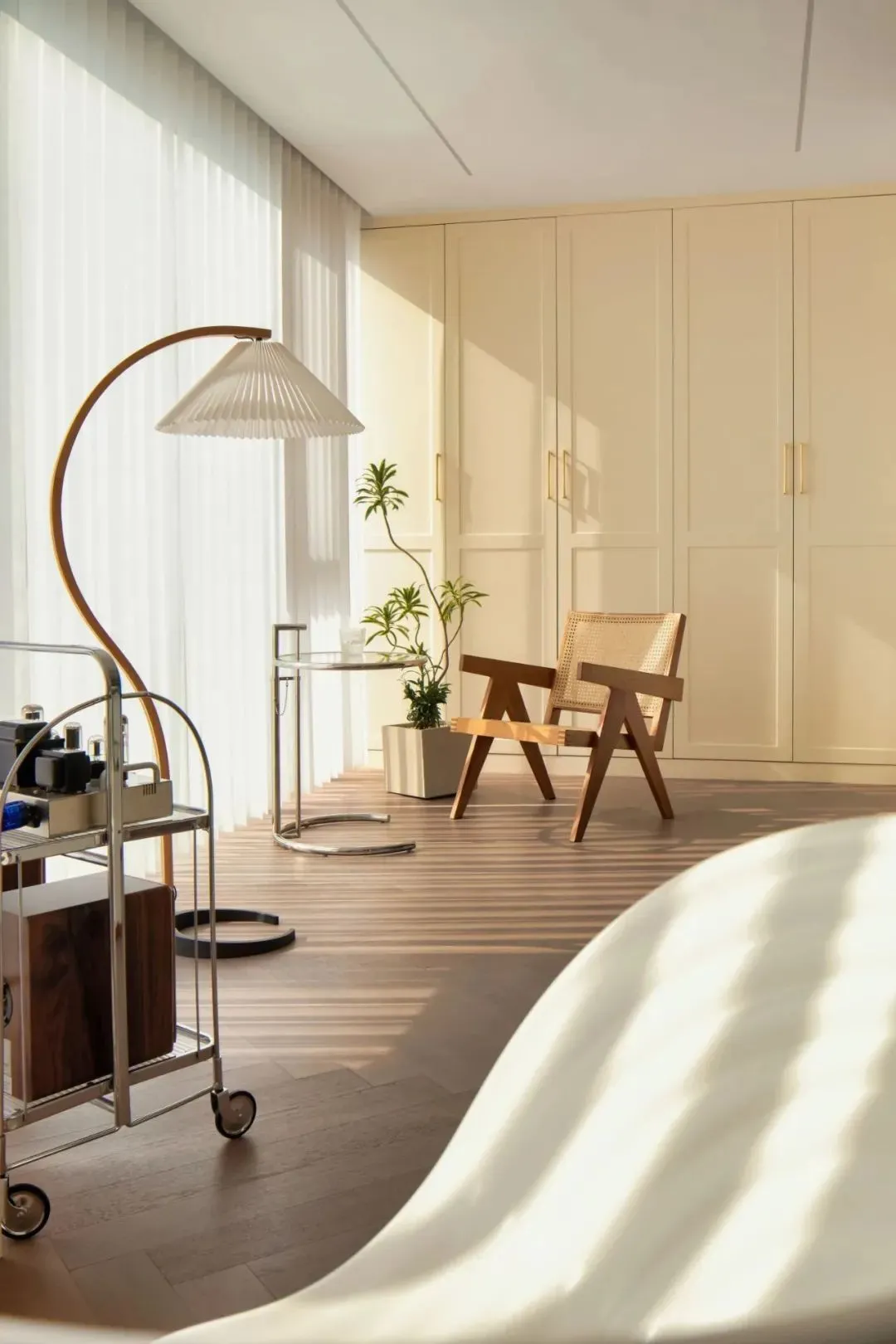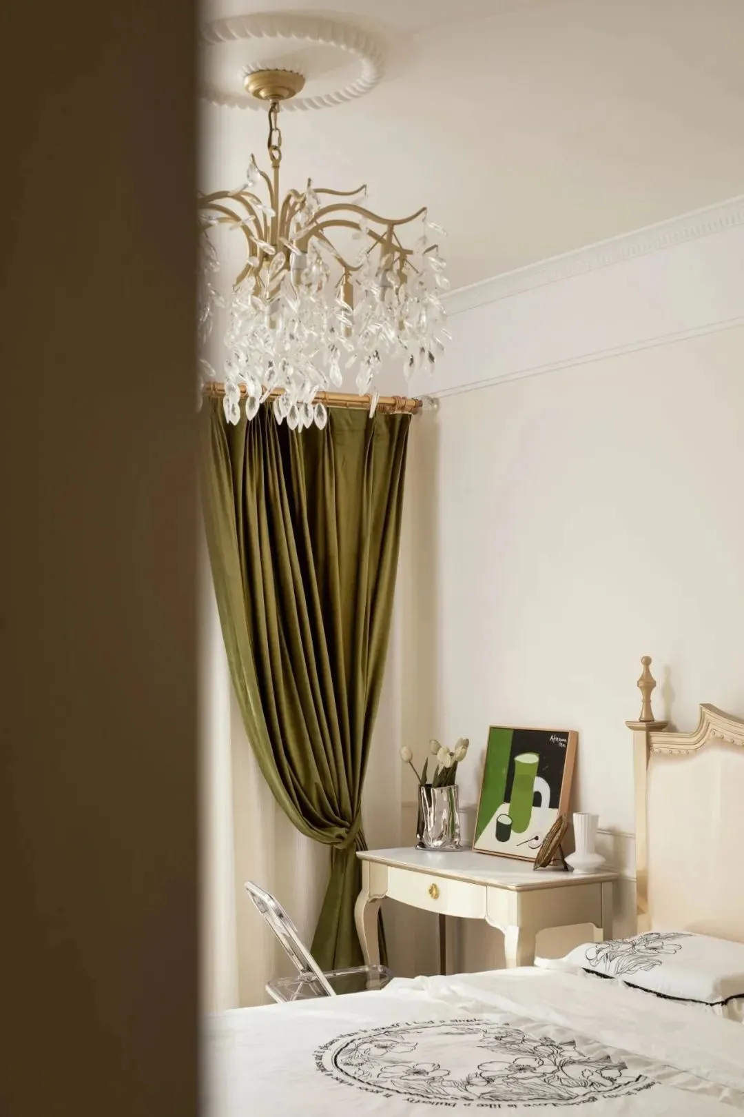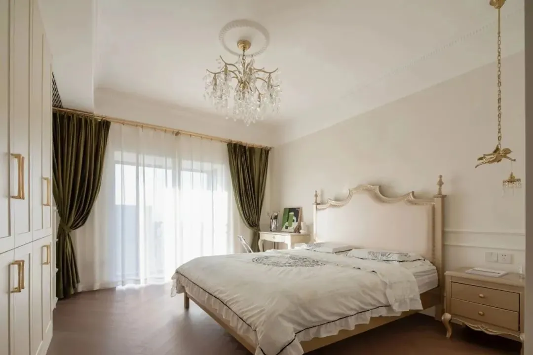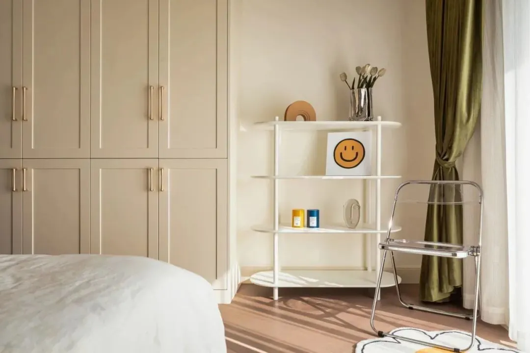 The color scheme of the master bedroom continues the space, the combination of off-white and coffee color is attractive and advanced, and the unique side table design is full of sense. The sun shines in, and the dark green curtains just add a touch of retro color to the space.