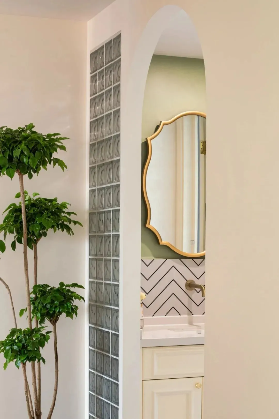 The wet and dry separation of the bathroom achieves comfort upgrade, and the outward movement of the washstand provides great convenience for daily use. It is a perfect combination of design ingenuity and practicality, and the glass brick partition adds transparency.