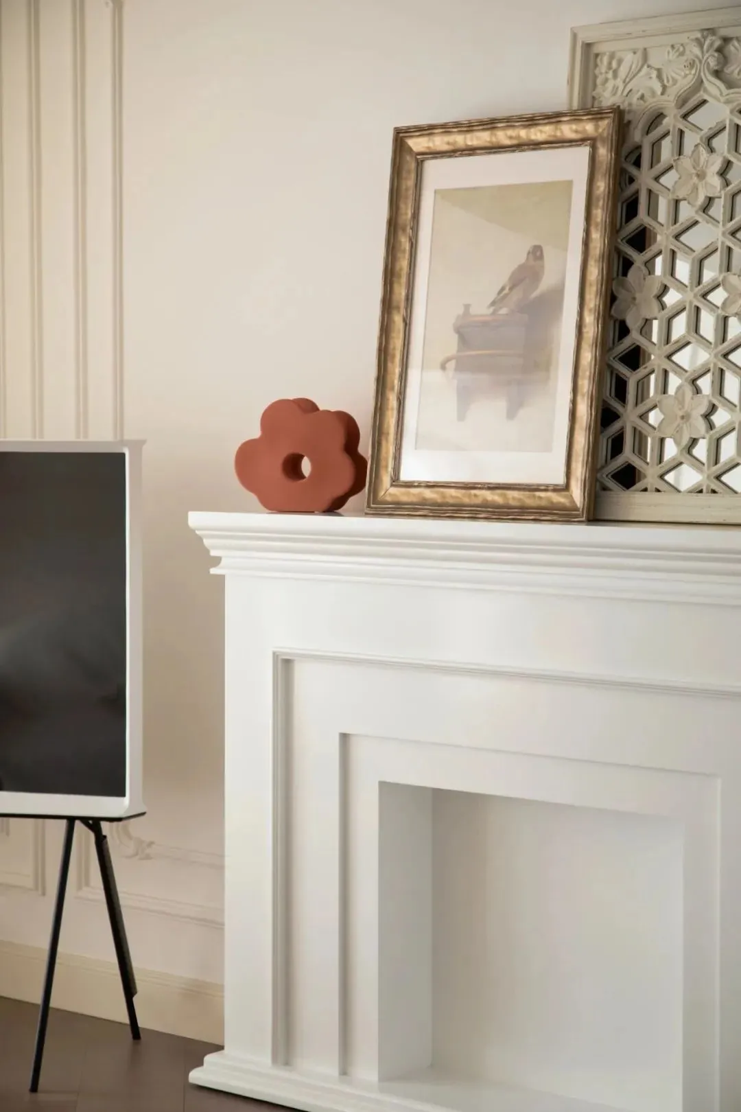 Instead of mounting the TV on the wall, a more flexible method is adopted. The bracket is placed in the corner of the TV wall, and the fireplace becomes the visual center. It is a decoration and a wish. The fireplace generates a flame, and it also contains a beautiful fairy tale fantasy in the light.