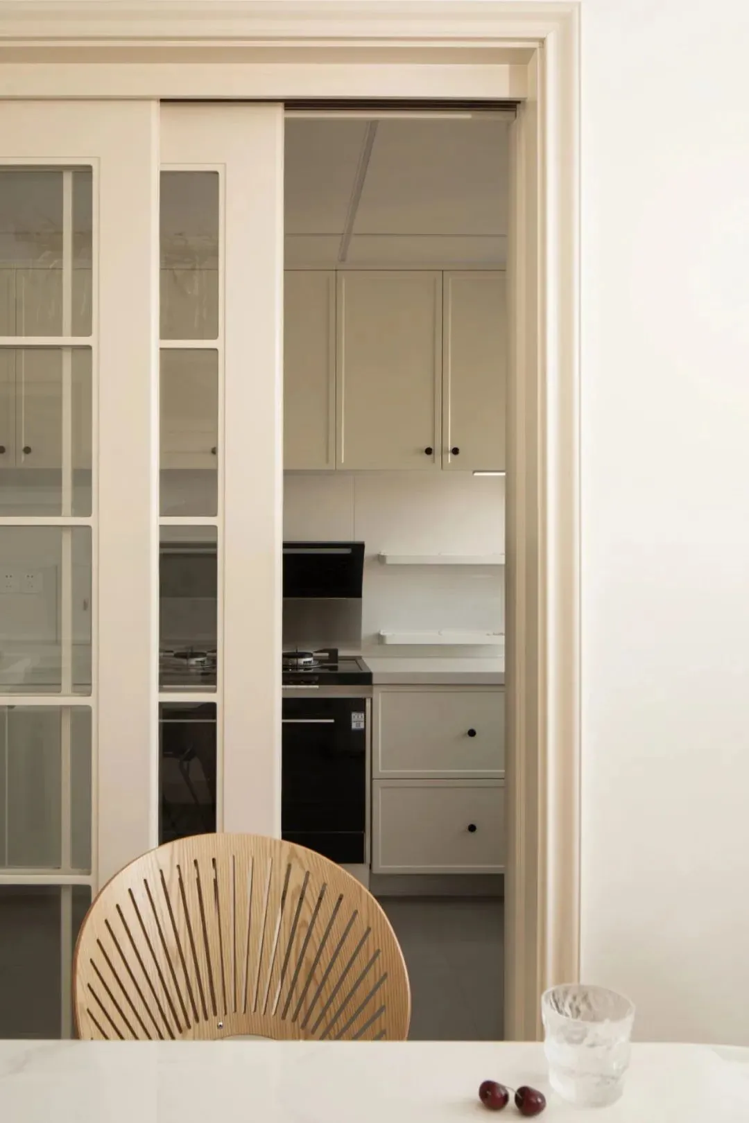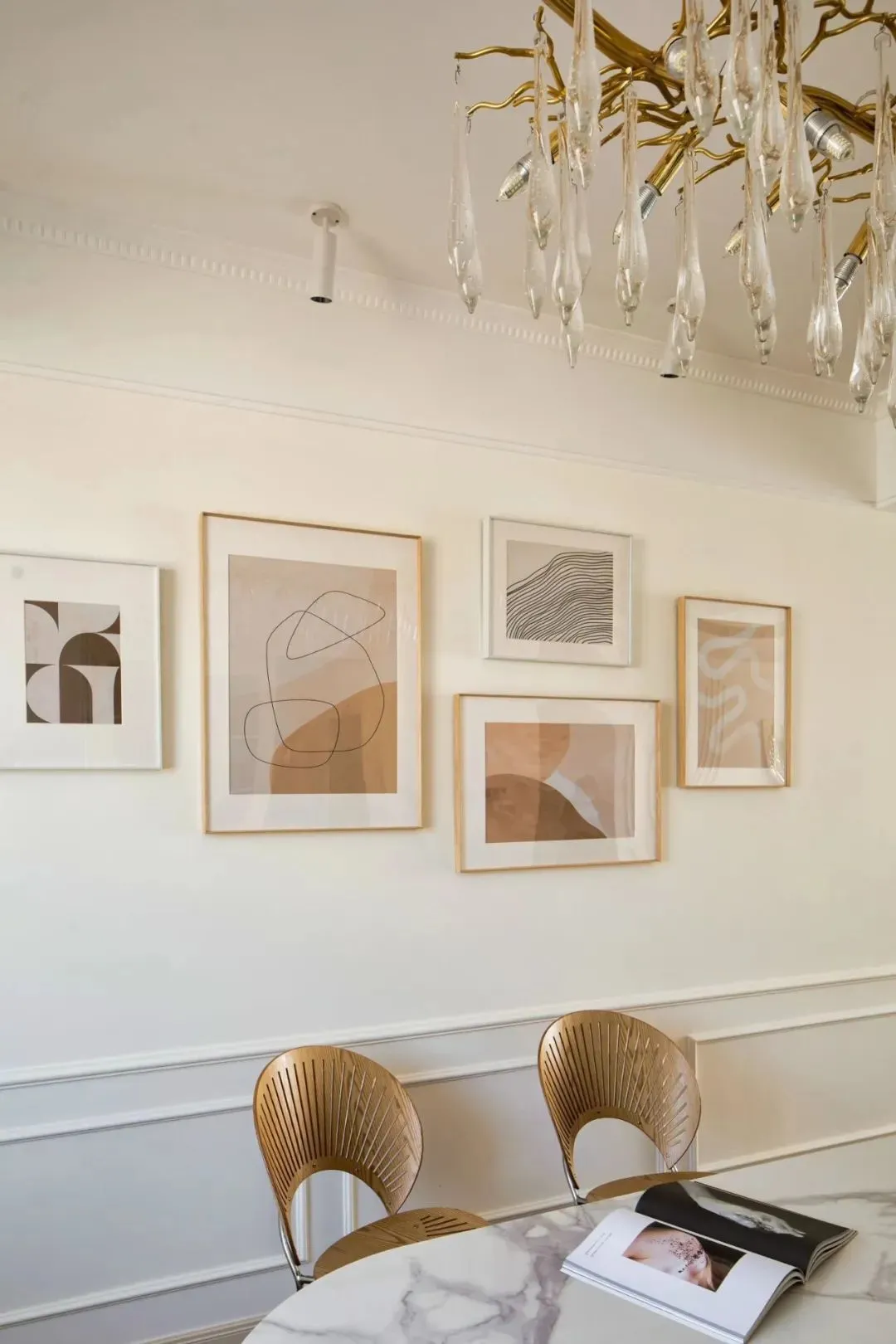 The island table foreshadows the elegant mood. The storage island table + rock slate dining table + wooden shell chairs, and the jumping branch water drop chandelier add color to this plain space, and the fireworks about life become poetic and soft.
