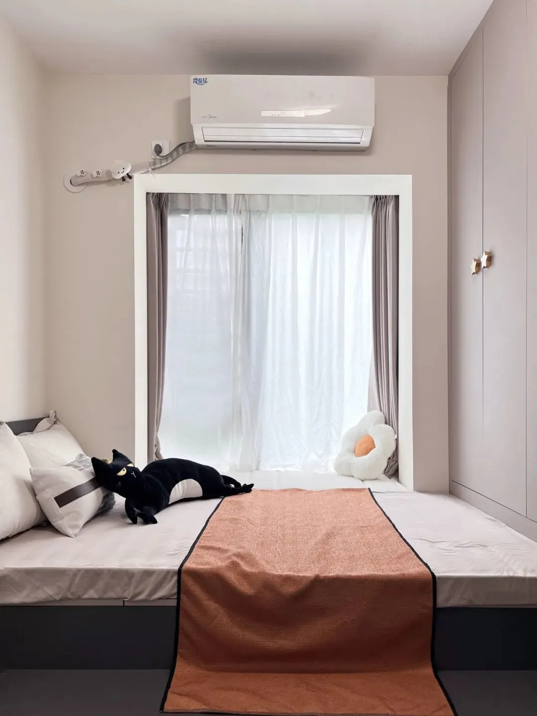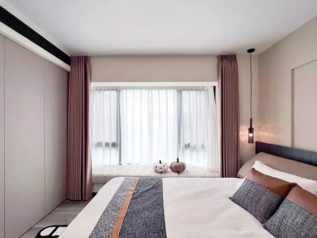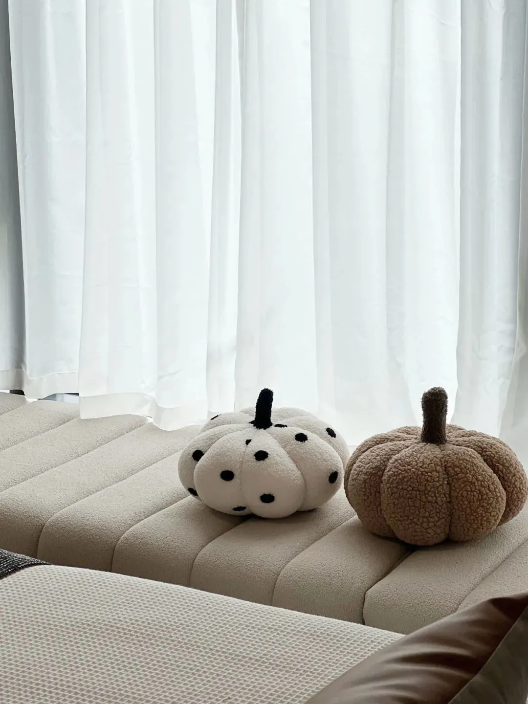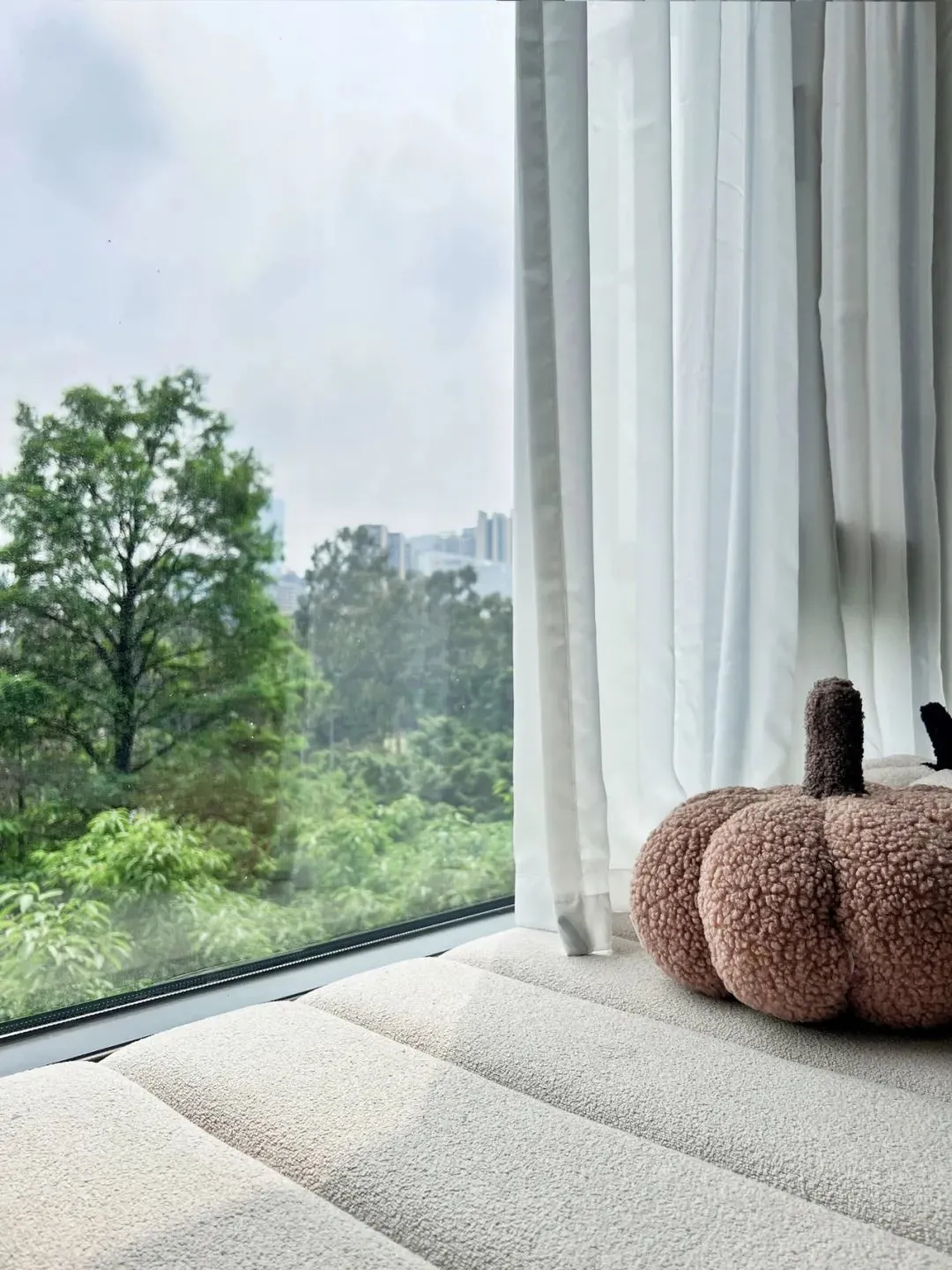 The bedroom has made a bay window, and the milky bay window cushion is thick and soft, with two cute pumpkin dolls on it, which is super healing! The thin white gauze curtain will not affect the lighting, while increasing the privacy of the room.