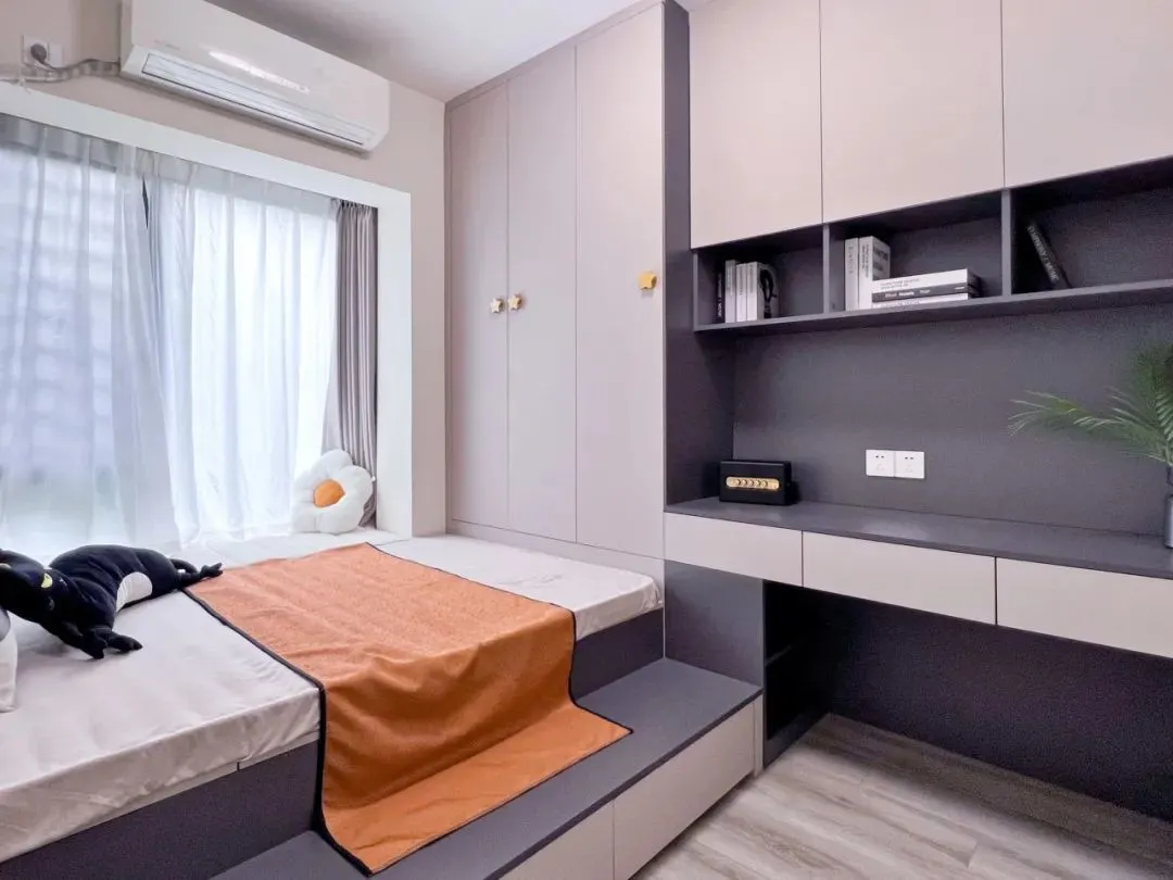 Considering the growth needs of children, the trapezoidal design of the bed can be modified to add aCustom cabinet fills the ladder, the area of the bed is expanded, and then connected to the soft-packed bay window, so it won’t feel crowded at all!