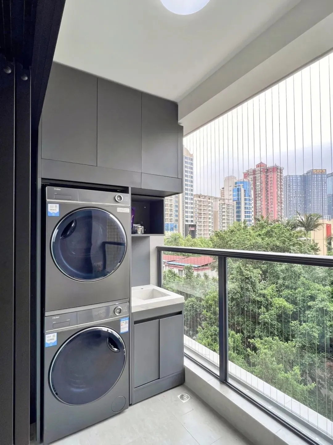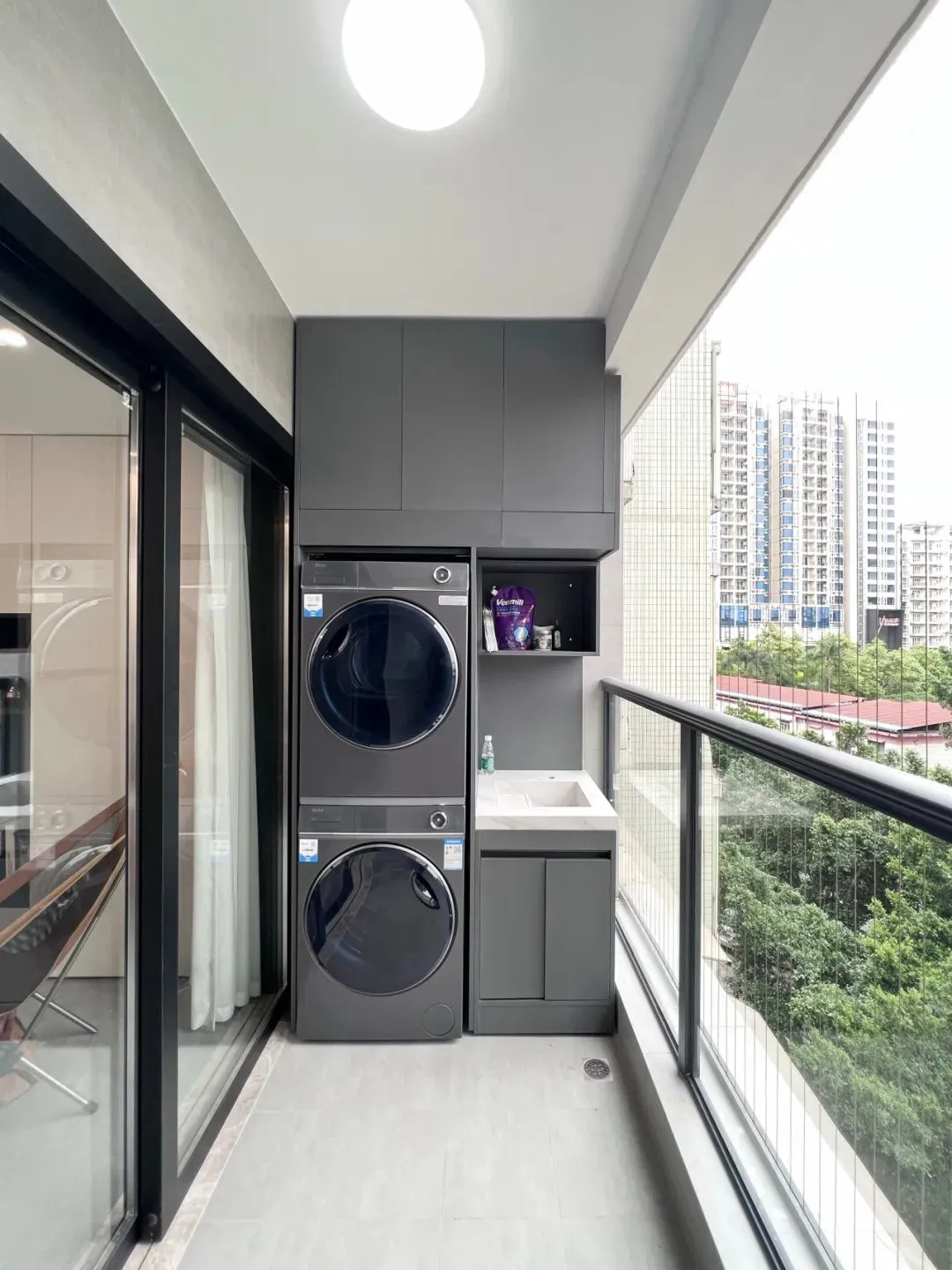 On the other side is the sink and laundry companion, where daily washing and drying are carried out. The upper cabinet can also be used to place some infrequently used items.