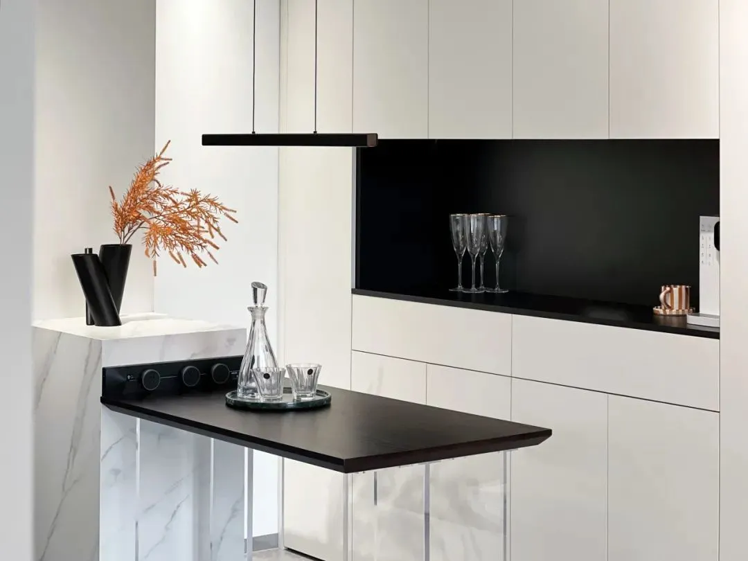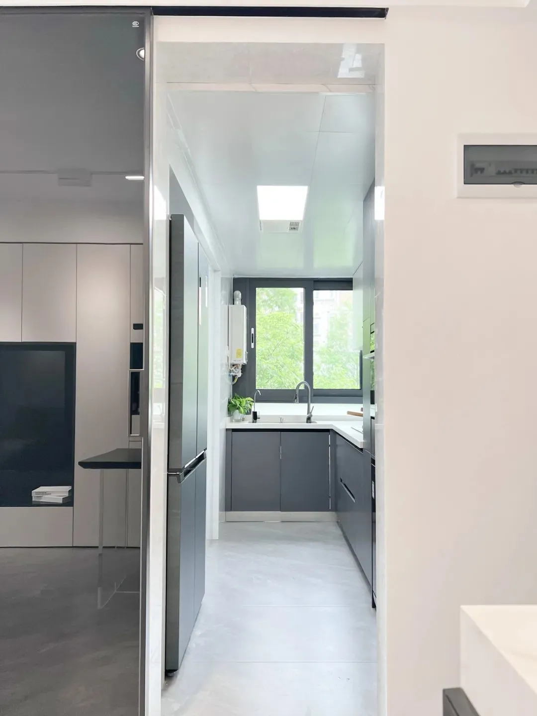 The kitchen adopts the upper sliding rail sliding door, which makes the space very simple and more convenient to clean. The black glass forms a mirror effect, expanding the visual sense of the space.