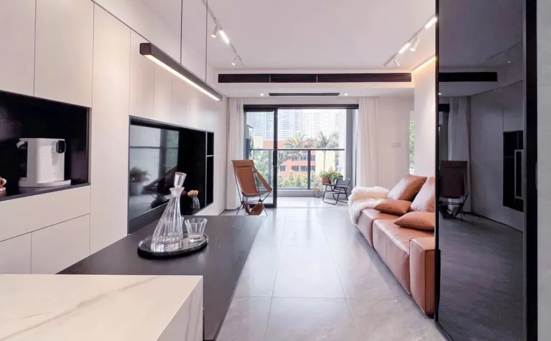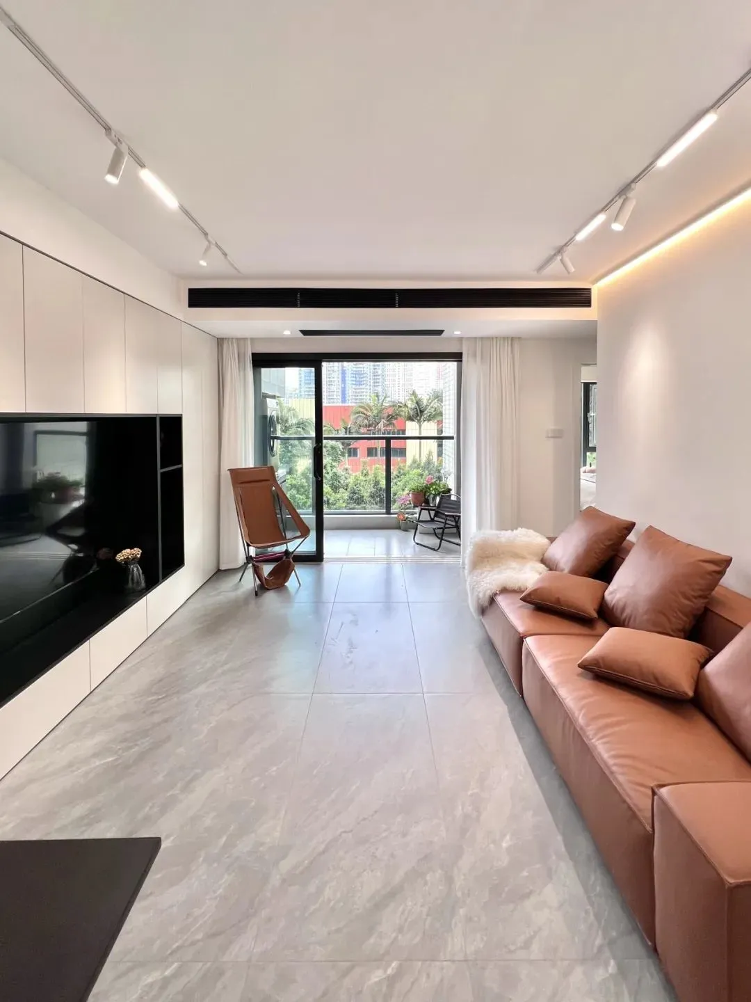 ⭐ With the design without main lamp and the expanded balcony, the lighting of the house has been improved, and the space feels spacious and bright. Moreover, a TV wall cabinet without door handles has been added, and the overall simple visual sense has both practical functions.