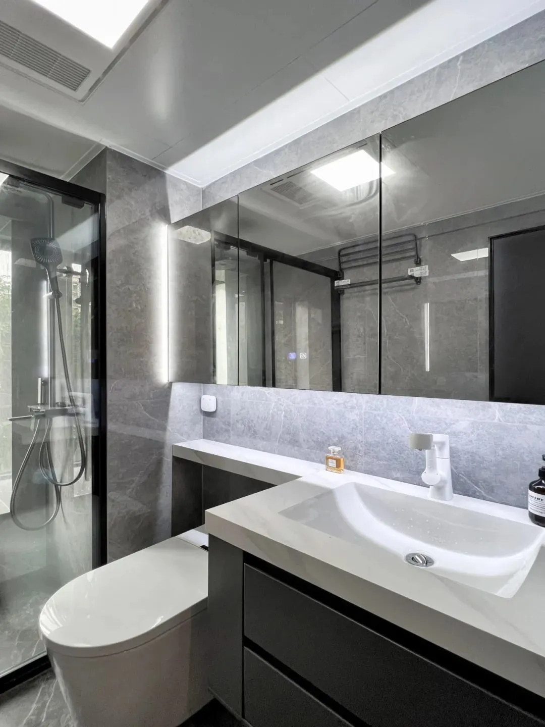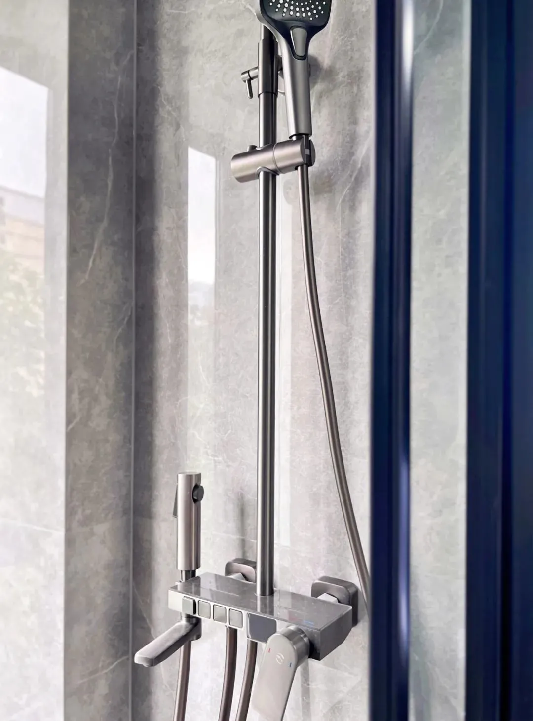 The bathroom area is small, the bathroom is partitioned by Changhong glass sliding doors, and it is equipped with Jiumuwang’s online celebrity multifunctional shower head, which is advanced and practical.