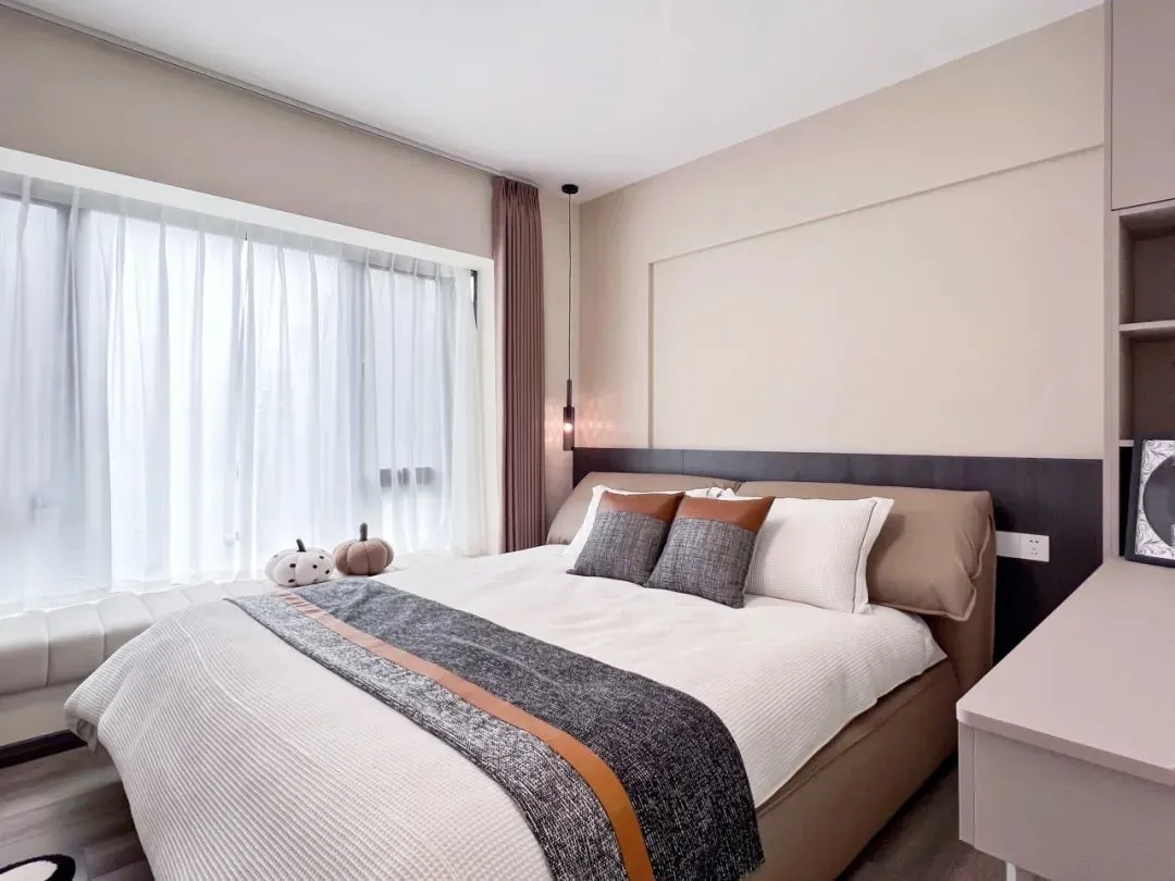 The owner hopes to have a warm and quiet bedroom, so the designer uses many soft elements.