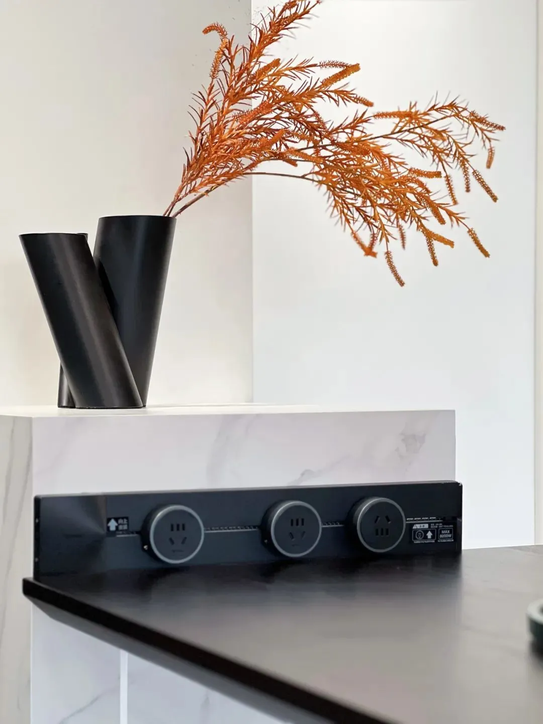 Across the porch cabinet is the dining room, and the marble island platform of Yashibai acts as the connection between the porch and the dining room. The hostess likes to raise flowers, and this island platform is used to place flowers for her, so that the scenery of flowers and plants indoors and on the balcony can echo. The dining table is made of black solid wood tabletop, and the acrylic legs create a high-level suspension effect. A row of track sockets are placed at the edge of the table connected to the bar, which is very practical.