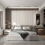 The room is covered with warm oak floors, and a checkerboard plush carpet is placed at the end of the bed to facilitate living. The round ceiling main lamp softens the lines of the bedroom.