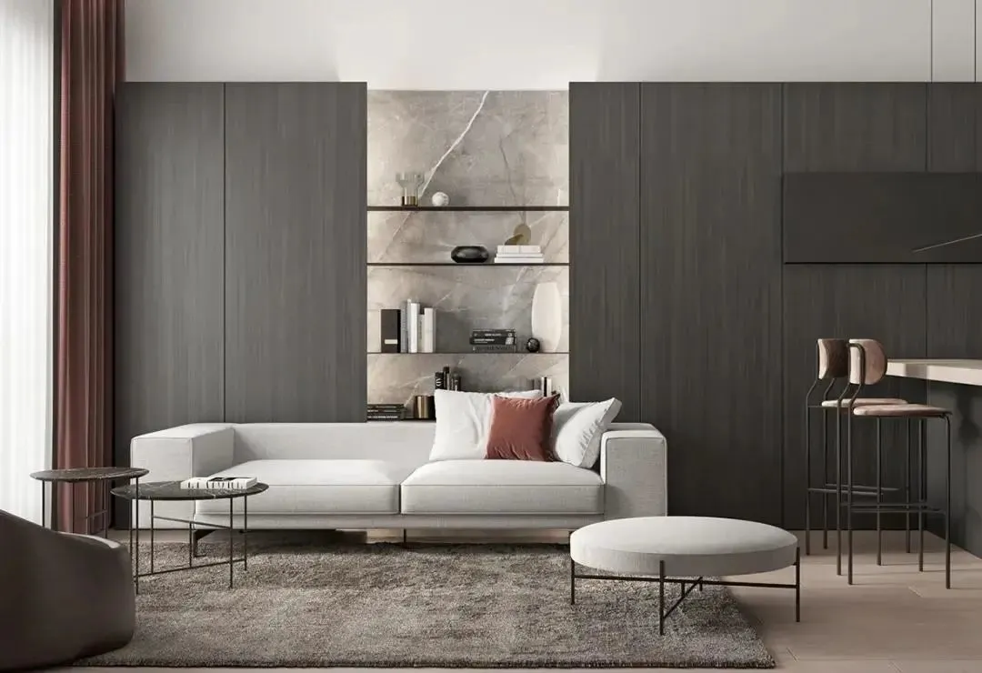 ③ If you make a whole wall cabinet sofa, don’t lean against the wall. You can leave a passage distance of about 0.9-1.2 m between the sofa and the cabinet. This design is not recommended if the living room space is too small.