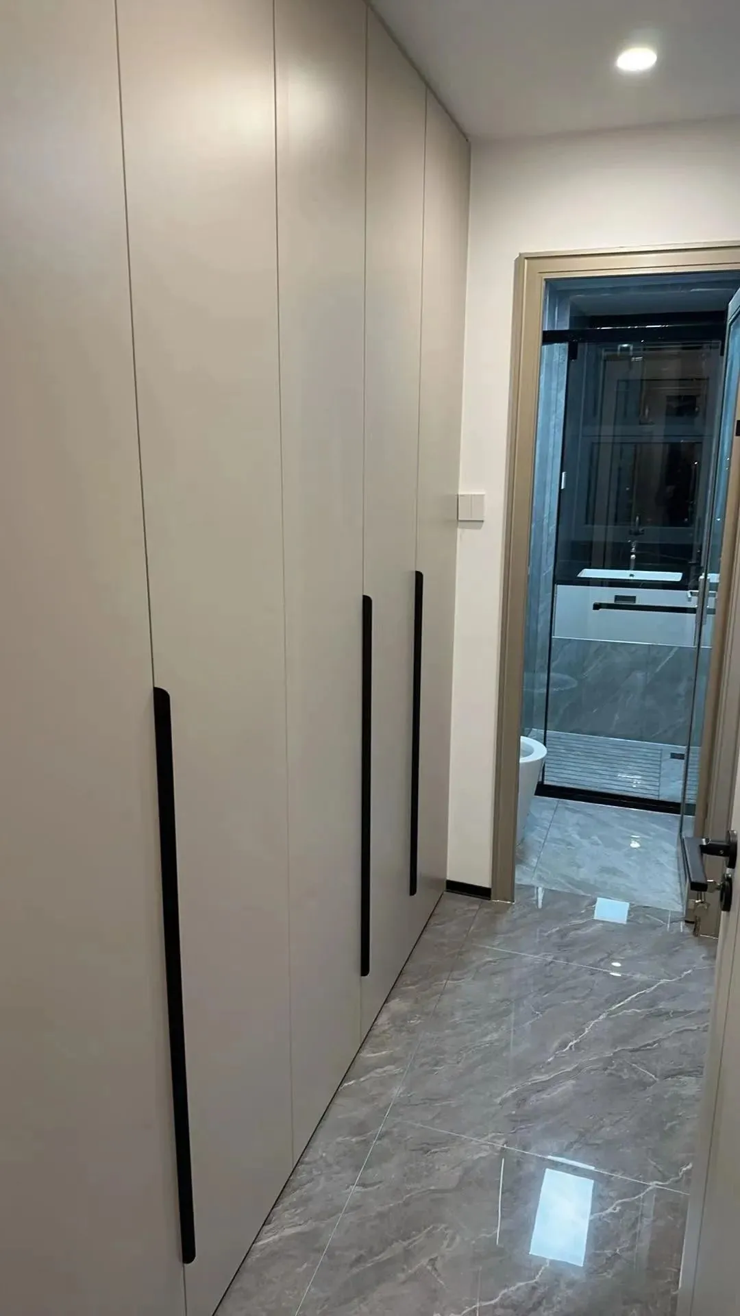 The wall-covered storage wardrobe on the left side of the door makes full use of the wall space, expands the storage space, and avoids visual fatigue and space waste caused by scattered clothes.