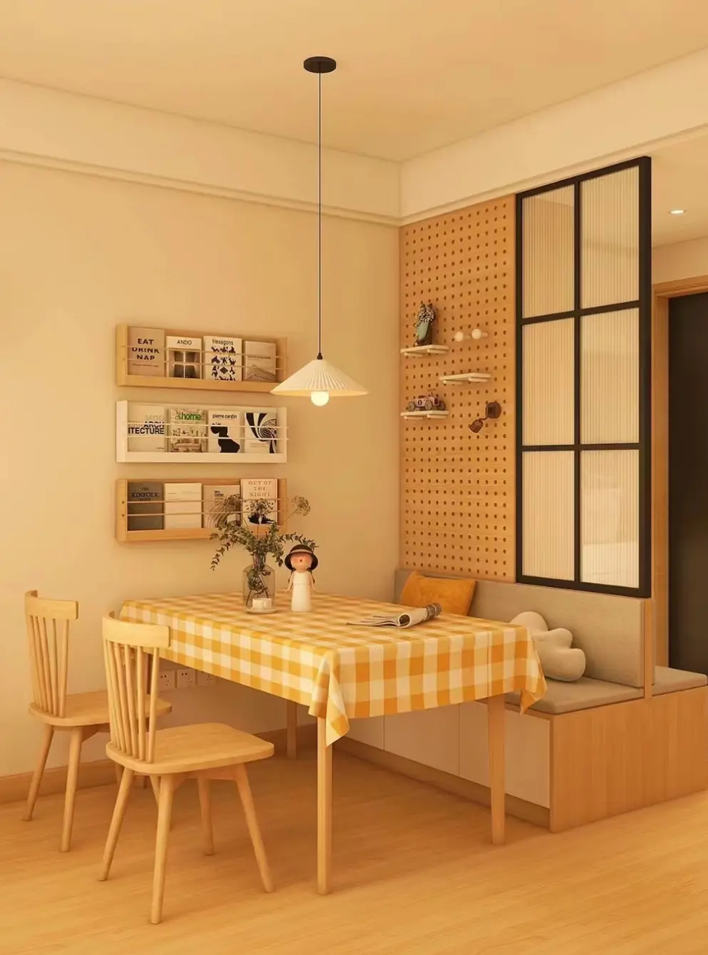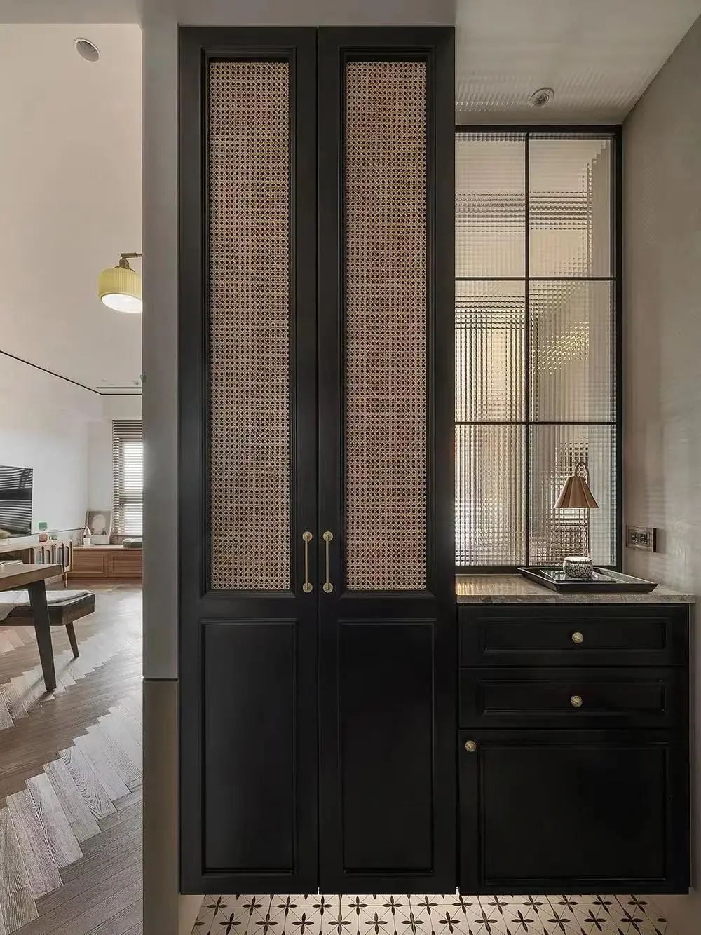 The entrance space is small and next to the restaurant, so it is difficult to implement the ordinary partition scheme. Then change your thinking and link the entrance with the restaurant. The double-sided booth design has a restaurant seat on one side and a shoe-changing stool on the other. It can also have a small space. Have big functions.