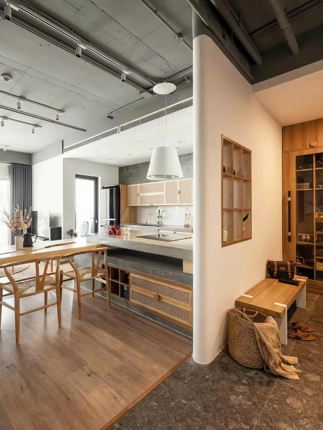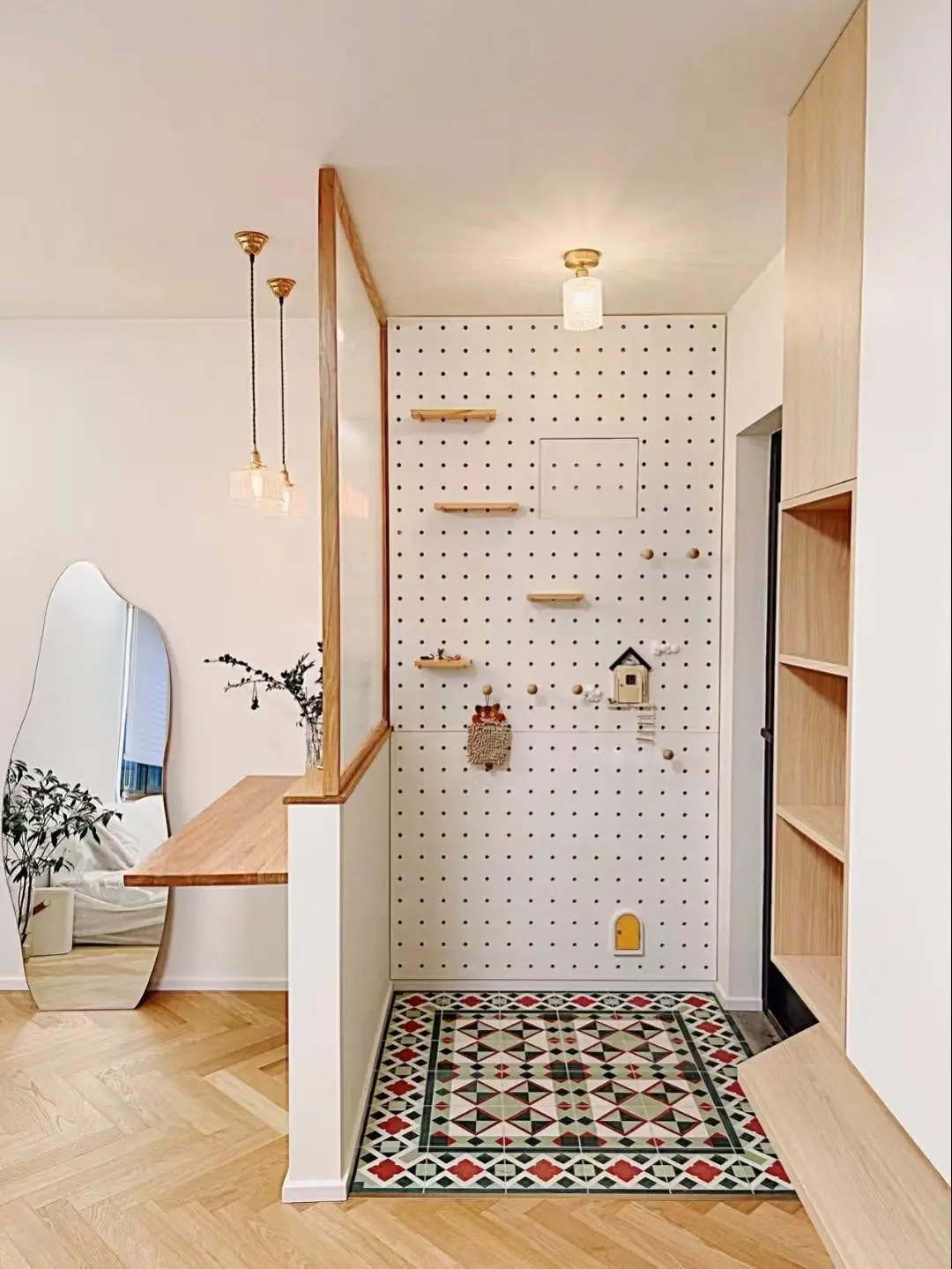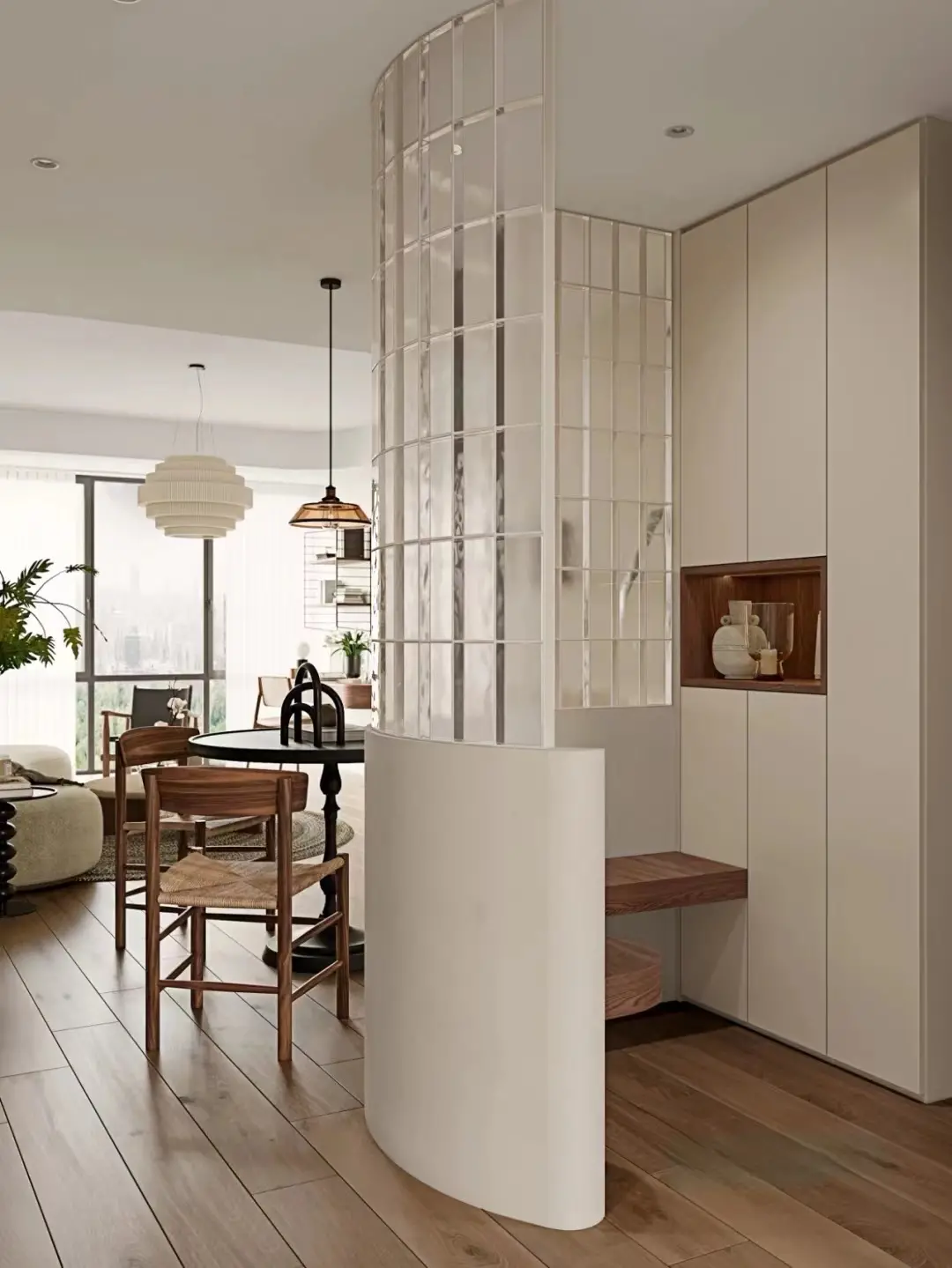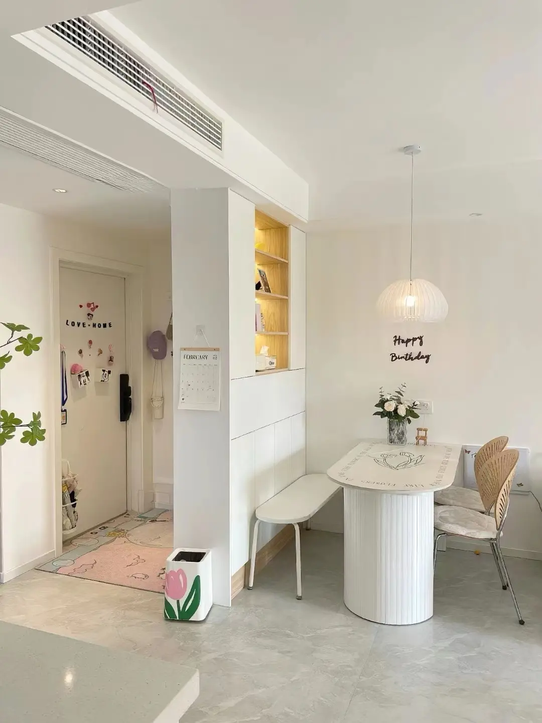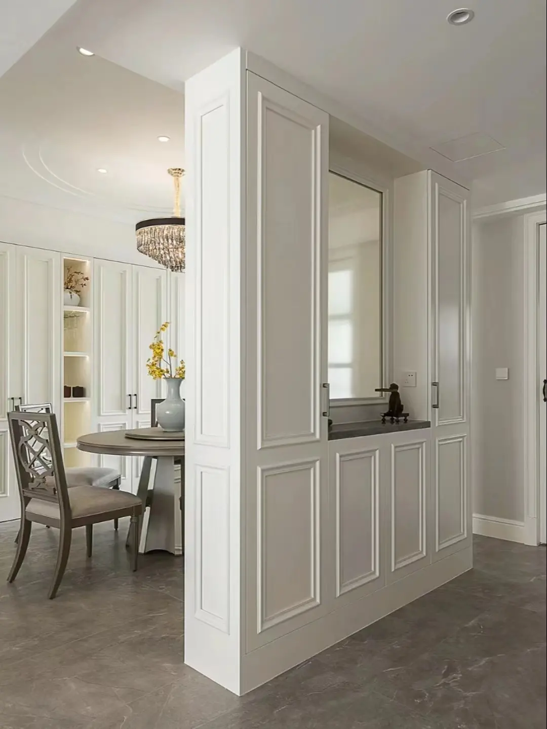 The simplest and rudest thing is to build a new wall between the entrance door and the dining room to divide space and functions, while blocking the line of sight outside the door and enhancing the privacy of the house. If you feel that the wall is too rigid and bulky, you can only build half the wall, or make slots in the wall to make lattice windows, and make arcs on the edges to make the space transition smoother.