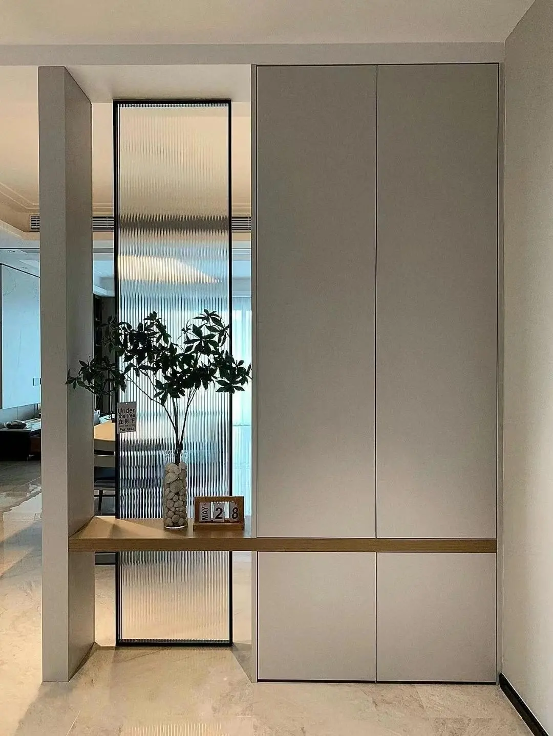 If the entrance space is relatively large, the wall partition is stiff, and the high cabinet is depressing. You can choose the sliding door as the partition, which is flexible and light, and at the same time has the decorative effect of glass partition and screen partition, which not only divides the function but also does not affect the continuity of the space.