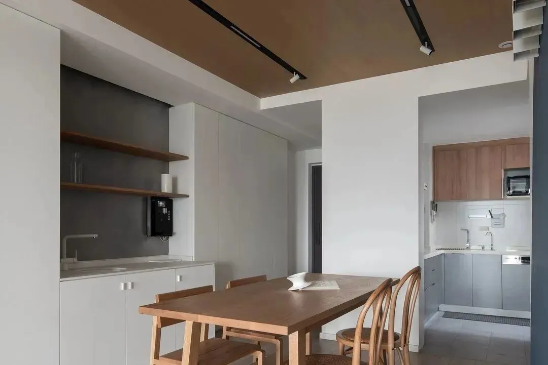 The classic combination of solid wood long dining table + four back chairs is classic and timeless. The combination lighting of track spotlights reduces the heavy feeling of wooden ceiling and furniture, making it lighter.
