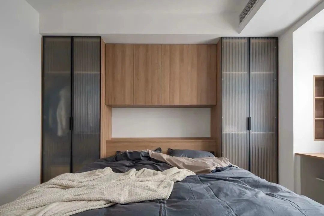 Space is limited, and adoptsCustomized wardrobe and bed combination, hanging cabinet + top wardrobe on both sides of the bed, the bottom of the bed is designed in the form of drawers, which greatly improves the storage function, is beautiful and practical and does not take up space.