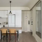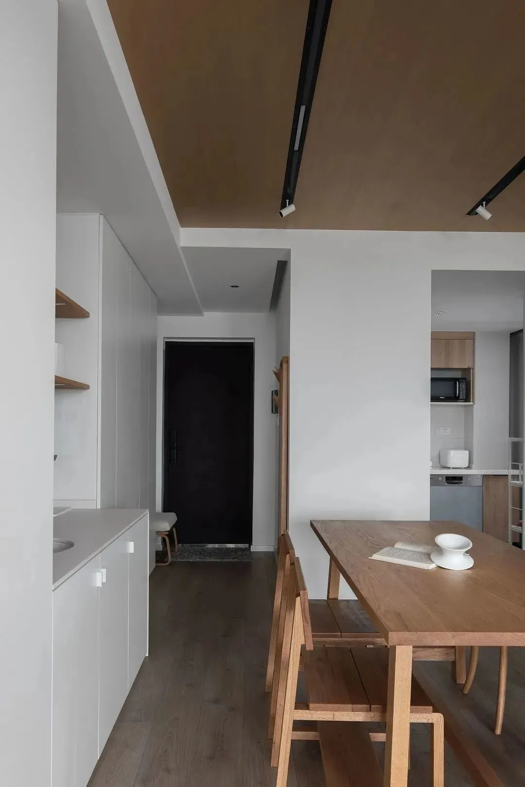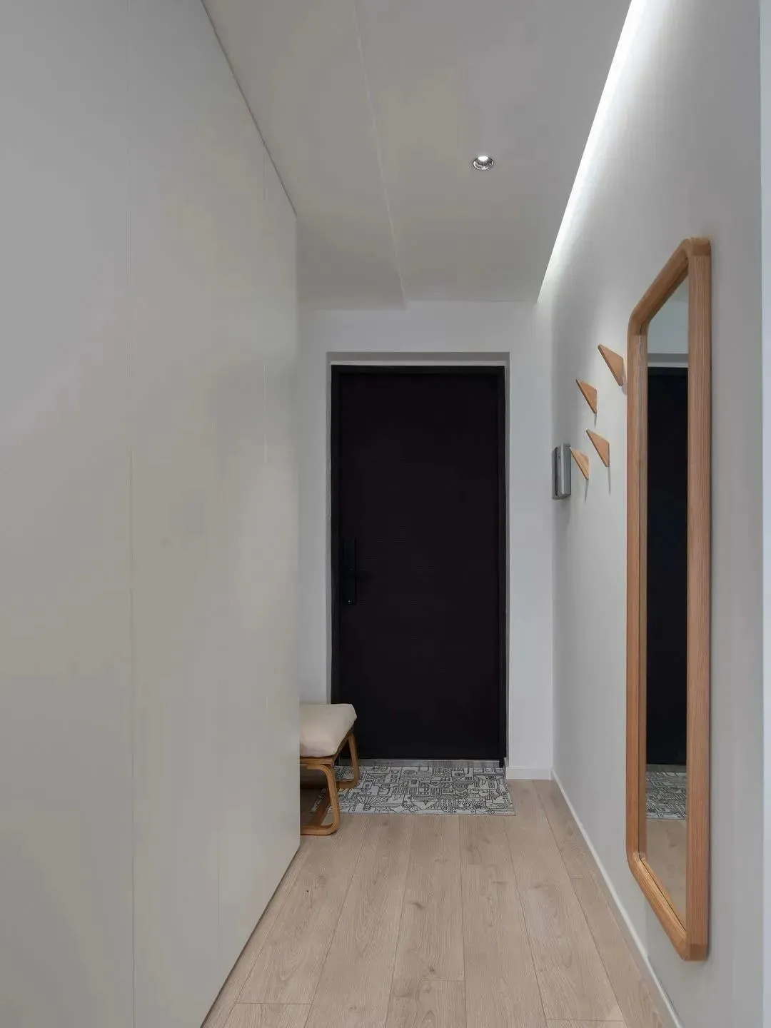 Entering the house, according to the inertia layout of the owner’s storage, the combination of shoe cabinet + shoe changing stool on the right side of the door. On the other side, a wooden hook is installed to gather and summarize keys, bags, hats and other small objects, and a wooden full-length mirror is convenient to tidy up your appearance when going out. Clothes can also be matched with suitable shoes here.