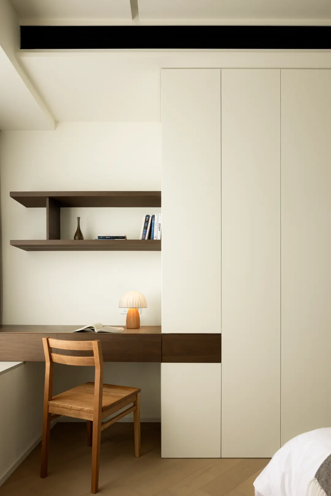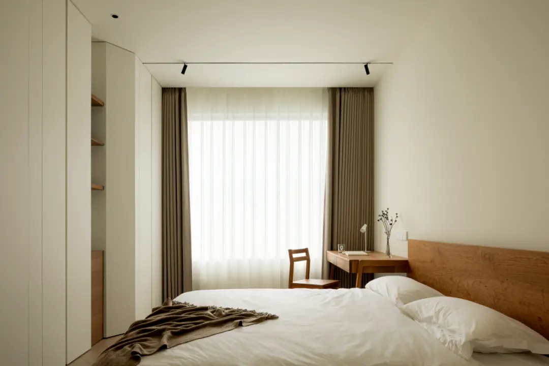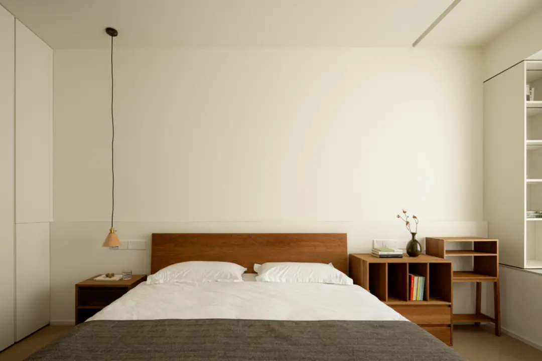 The custom-made high cabinet at the end of the bed, and the door design without handles will not cause visual clutter, continuing the minimalist design language.
