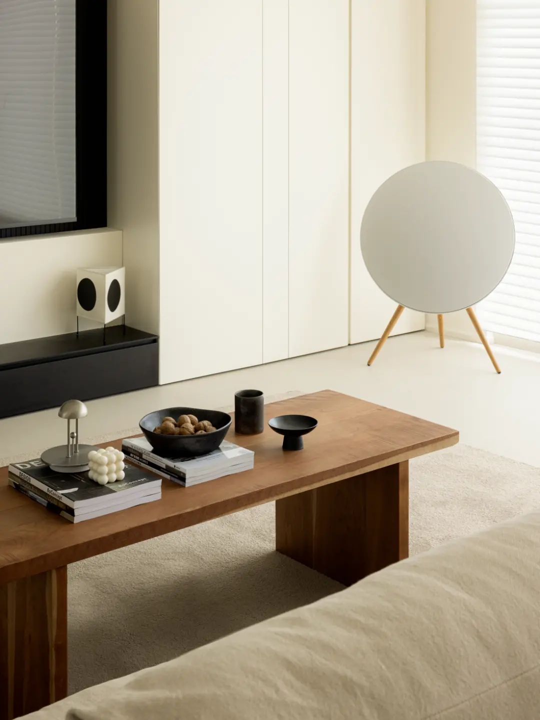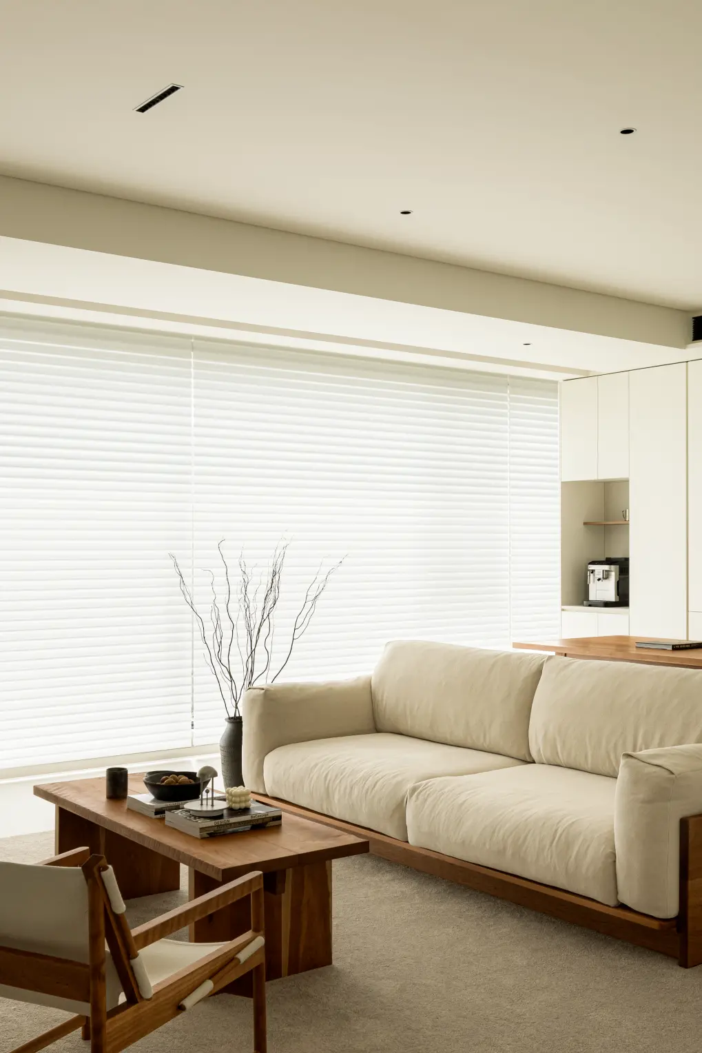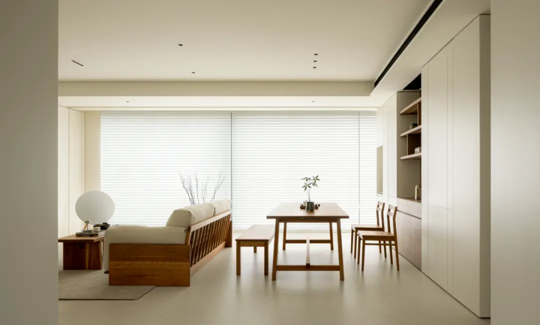 The balcony is merged into the living room, and the load-bearing wall that cannot be dismantled is covered by the cabinet, which integrates the living room with the balcony, and also increases the storage function. Large floor-to-ceiling windows + venetian blinds allow natural light to fill the living room, creating a warm and comfortable atmosphere.