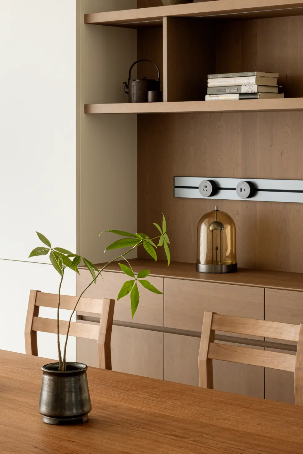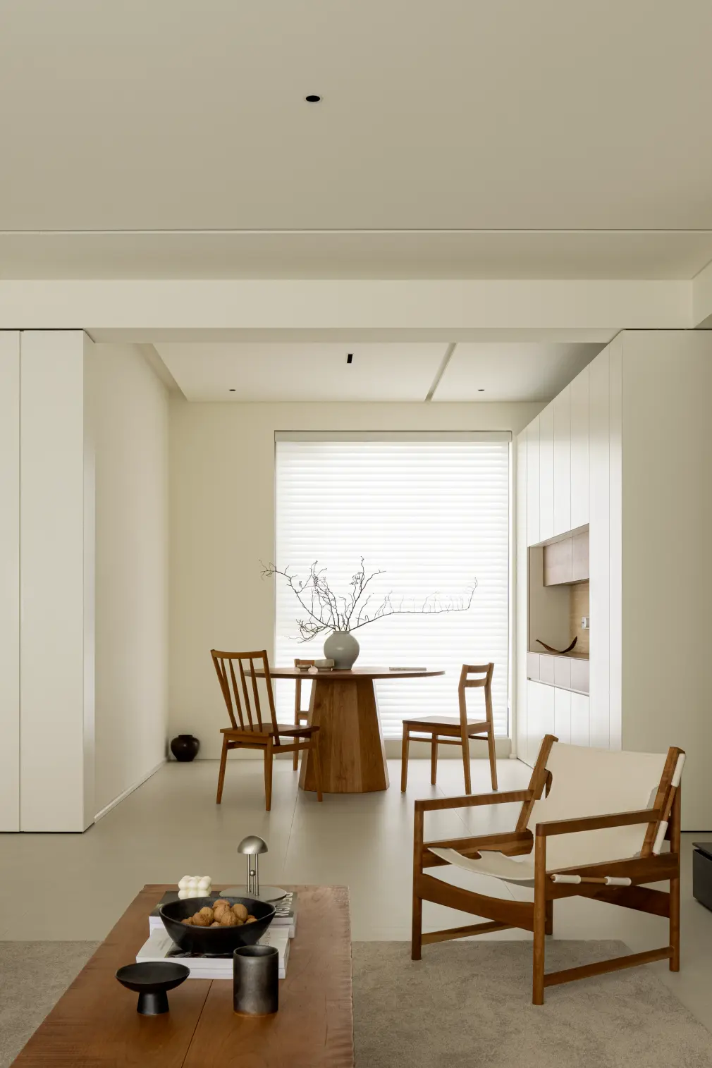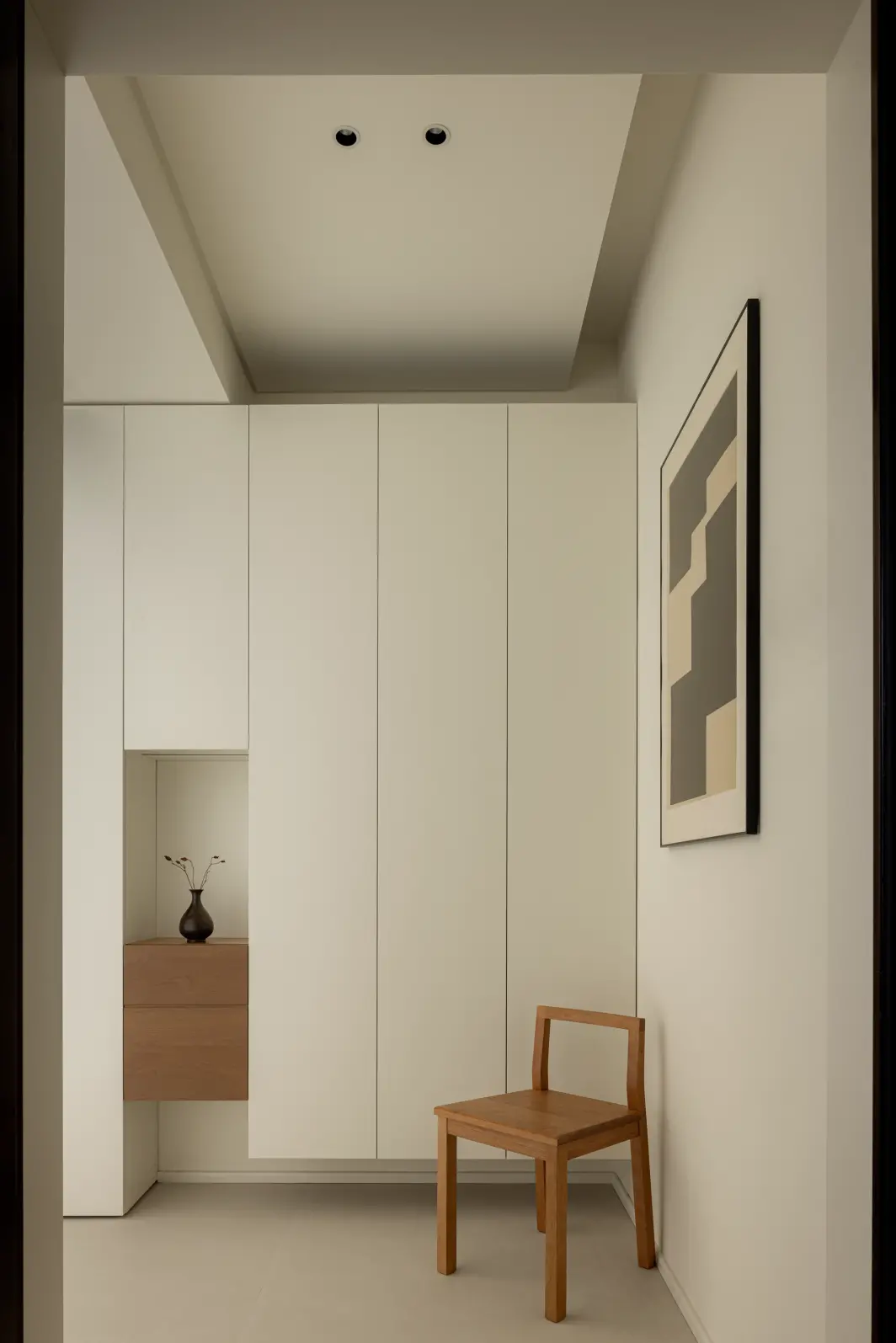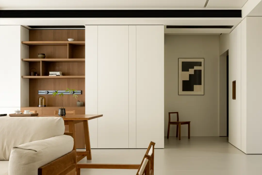 The suspended chest of drawers embedded in the whole wall cabinet seems to be an end scene, which finds a clever balance between practicality and aesthetics. Floral arrangement is the finishing touch and adjusts the space atmosphere.