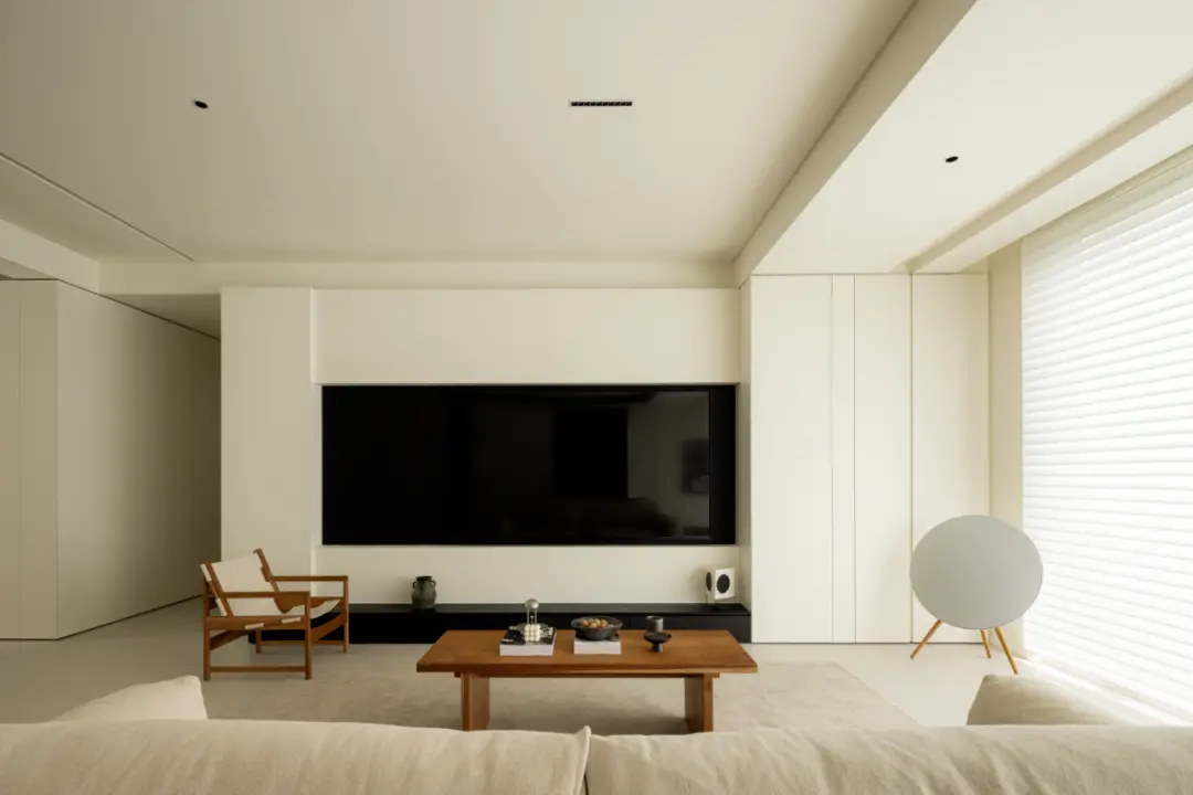 The living room opens the design of the home with a minimalist style, light-colored soft light turns to the pavement, and the wall and top surfaces are used to express the width of the space. The TV background wall is intertwined with warm white background color and black blocks, just like a black and white artist, which does not appear empty, but also adds a sense of hierarchy to the space.